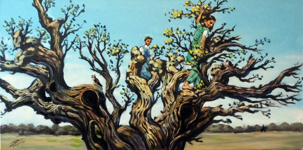 Jinsu Du, Künstlername Lao Du, wuchs in der Stadt Yinchuan in Westchina auf. Sein Talent wurde früh entdeckt und er erhielt ab dem Alter von neun Jahren privaten Zeichenunterricht. Sein Kunststudium absolvierte er in der Abteilung Illustration & Drucktechnik an der Xi‘an Art Academy. Danach arbeitete er zunächst als Bühnenbildner bei der Ningxia Opera Troup, bevor er sich entschloss, in die Hauptstadt Peking zu gehen. Dort wurde er von der Tageszeitung Beijing Youth Daily entdeckt, für die er jahrelang als Karikaturist, Bildredakteur und Layouter arbeitete und mehrere Preise erhielt. Gleichzeitig realisierte er immer auch eigene, freie Kunstprojekte. Seine Bilder wurden in China und im Ausland ausgestellt. Motive, die ihn über Jahrzehnte begleiten, sind Darstellungen von Tieren/Menschen und ihrer Umwelt. Dabei geht es oft um Suche und Verlust und die Einsamkeit in der Moderne. Viele Reisen haben Lao Du gezeigt, dass diese Themen überall relevant sind, und so fließen Elemente aus verschiedenen Regionen und Kulturen in seine Arbeiten.